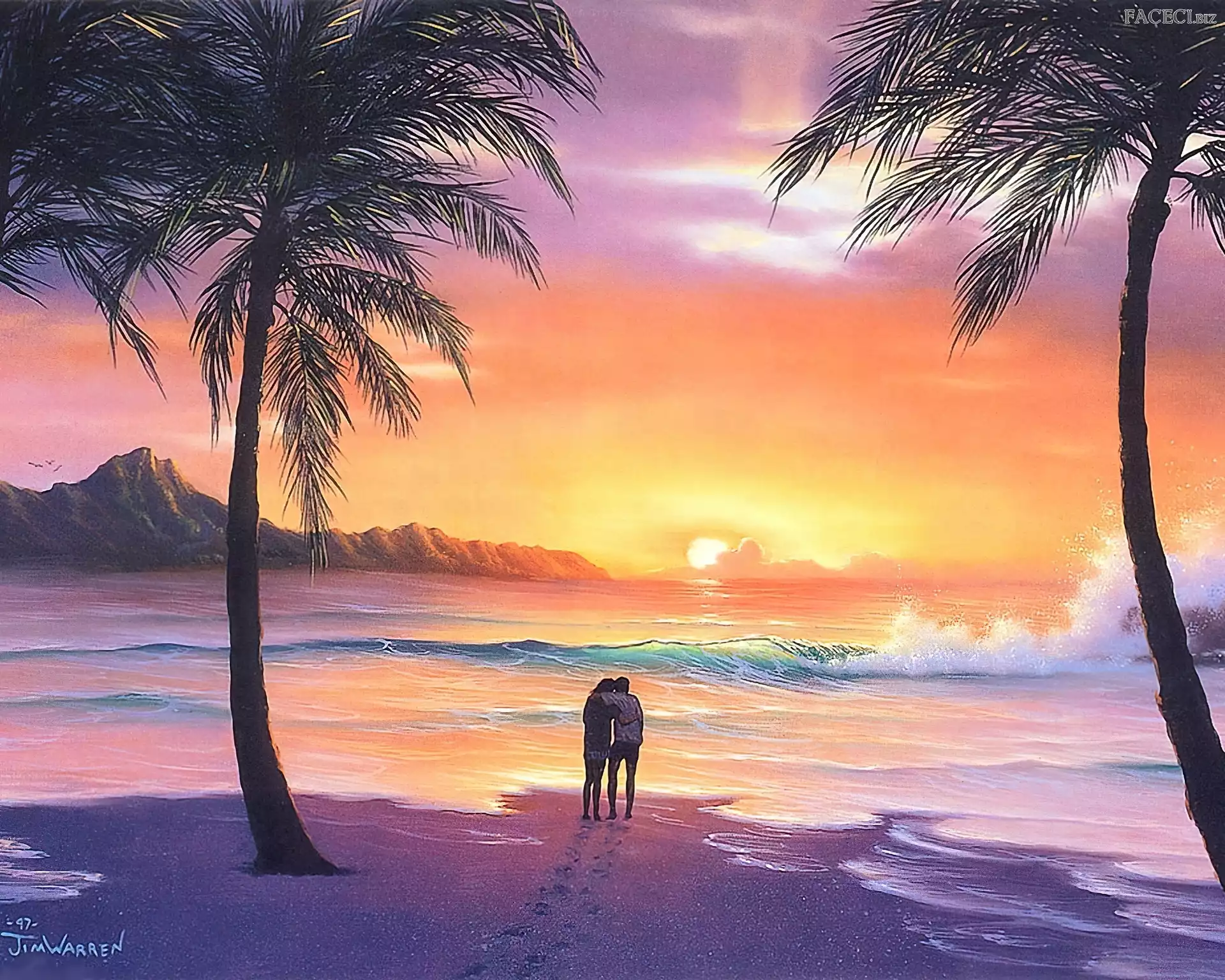 Zachód, Morze, Palmy, Zakochani, Plaża, Słońca - faceci.biz